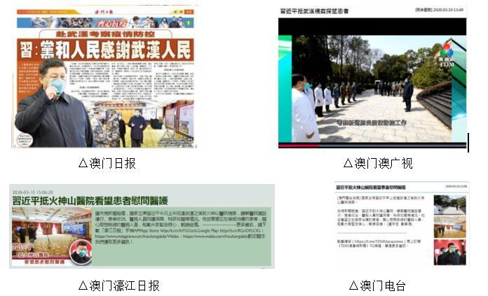 在澳门,当地时间3月10日,习近平主席赴武汉考察的新闻也已成为当日澳门各家主流媒体头版头条,澳门地区最大的广播电视媒体澳门广播电视有限公司(澳广视)、澳门电台、澳门地区发行量最大的《澳门日报》《华侨报》《濠江日报》《星报》等当地主流媒体均在第一时间报道了习近平抵达火神山医院看望患者慰问医护的新闻。澳门媒体评论说:中国最高领导人习近平来到抗击疫情最前线的武汉,具有风向标意义,并指出就在习近平来到武汉的当天已关闭曾为救治新冠肺炎患者而专门开设的14家方舱医院的最后一家医院,这意味着,中国疫情防控之战已接近尾声。澳门网友在留言中表示,习主席专程前往抗疫一线看望患者慰问医护,将极大提振全国人民战胜疫情的信心!为习主席点赞,为抗击疫情一线的医务工作者点赞!