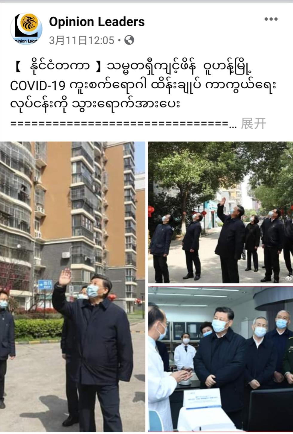 在缅甸,当地时间3月11日,缅甸网络媒体Opinion Leaders刊发《习近平看望武汉社区居民群众和防控一线工作者》《习近平强调 抗疫战要坚决打赢》等文章。缅甸执政党民盟中央宣传委员会书记蒙育瓦昂信在接受记者采访时说:疫情一发生,习近平主席就立刻亲自开始部署抗疫工作,这有效阻止了疫情的进一步扩大。而中国抗疫工作的关键一环封城,彻底控制了出省入省的交通,从这一点就能看出中国领导人、中国政府和中国人民的齐心协力和团结一致。