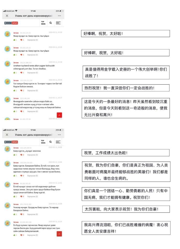 当地网民在留言中纷纷称赞中国,指出中国战胜疫情是值得用金字载入史册的一个伟大创举,并称赞中国人民是团结一心、勤劳勇敢的人民,是真正为祖国、为人类勇敢面对病魔并最终能够战胜的英雄们。