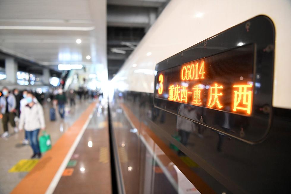 ↑4月12日,“川渝贵”省际环线高铁重庆首发列车在重庆西站等候旅客上车。新华社记者 唐奕 摄
