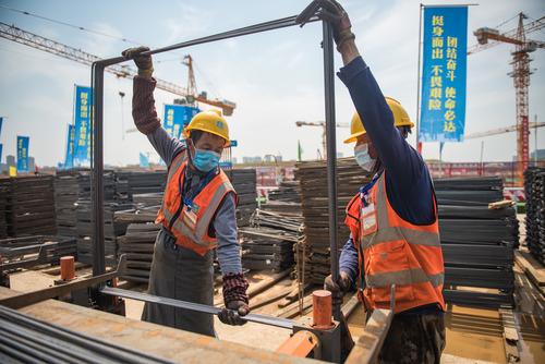 中建三局的建设者在武汉光谷大悦城建设工地作业(4月28日摄)。新华社记者 肖艺九 摄