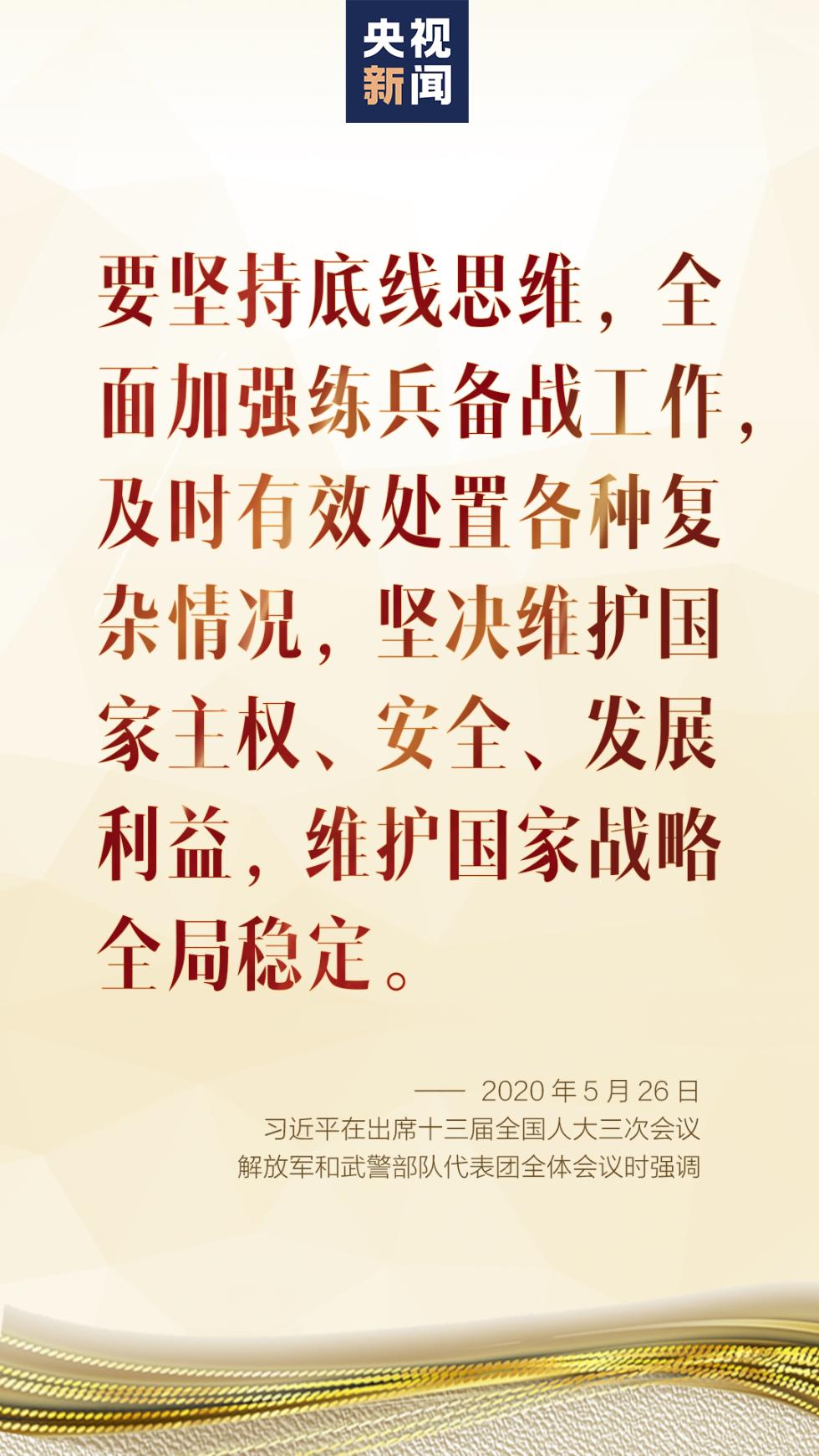 习近平结合做好疫情防控工作,就国防和军队建设重点工作提出要求。他强调,这场疫情对世界格局产生了深刻影响,对我国安全和发展也产生了深刻影响。要坚持底线思维,全面加强练兵备战工作,及时有效处置各种复杂情况,坚决维护国家主权、安全、发展利益,维护国家战略全局稳定。要探索疫情防控常态化条件下练兵备战方式方法,因时因势搞好科学调控,加紧推进军事斗争准备,灵活开展实战化军事训练,全面提高我军遂行军事任务能力。