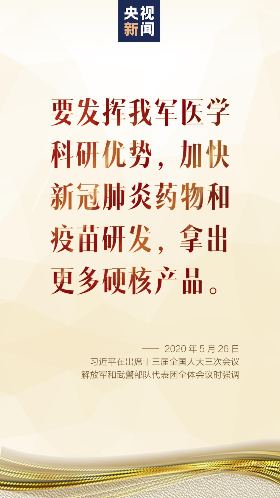 习近平指出,这场疫情防控斗争对国防和军队改革是一次实际检验,充分体现了改革成效,同时也对改革提出了新要求。要坚持方向不变、道路不偏、力度不减,扭住政策制度改革这个重点,统筹抓好各项改革工作,如期完成既定改革任务。对疫情防控工作中暴露出的新情况新问题,要注重用改革创新的思路和办法加以解决。要发挥我军医学科研优势,加快新冠肺炎药物和疫苗研发,拿出更多硬核产品。要坚持向科技创新要战斗力,加强国防科技创新特别是自主创新、原始创新。改革创新关键在人,要构建“三位一体”人才培养体系,打造德才兼备的高素质、专业化新型军事人才方阵。