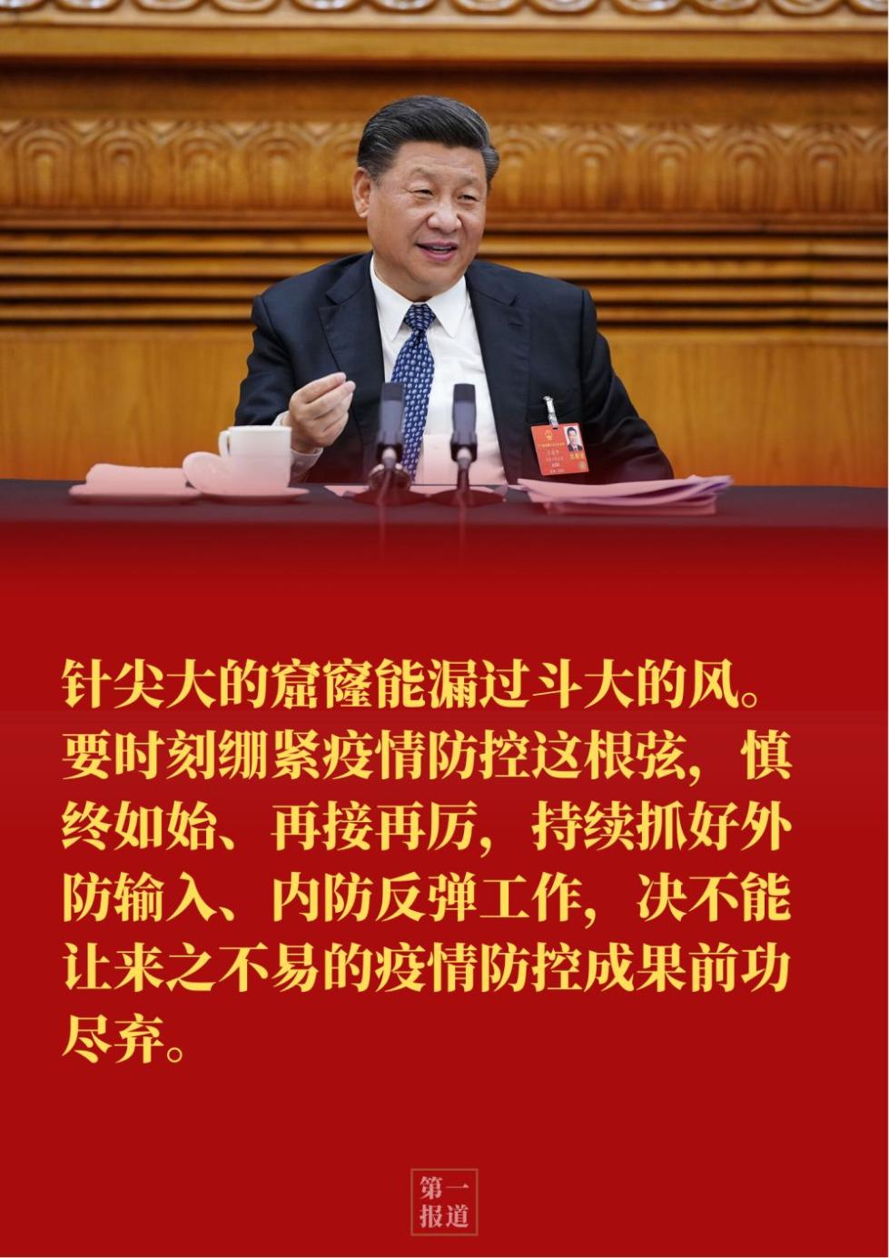 习近平指出:“针尖大的窟窿能漏过斗大的风。要时刻绷紧疫情防控这根弦,慎终如始、再接再厉,持续抓好外防输入、内防反弹工作,决不能让来之不易的疫情防控成果前功尽弃。”