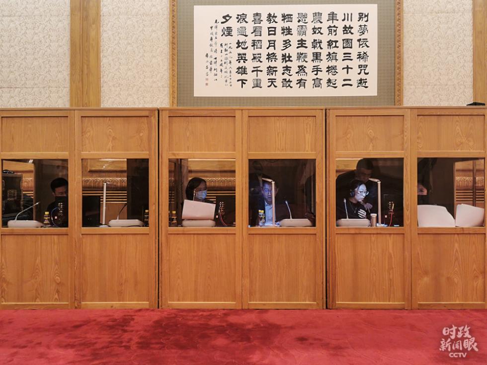 △现场有6位同声传译员,进行汉语、俄语和英语翻译。(总台央视记者黄京辉拍摄)