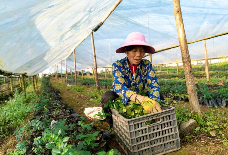 △2020年11月20日,在云南省西畴县山豆根规范化种植基地,一名务工人员在装运山豆根幼苗。目前,该县种植三七、重楼、山豆根等中药材8.2万余亩,中草药产业成为推动当地经济发展的重要产业,带动当地群众脱贫增收致富。