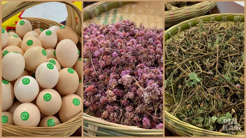 △化屋村走产业扶贫道路,发展特色种养殖业。这是土鸡蛋和两种头花蓼花。(总台央视记者郭晗光拍摄)