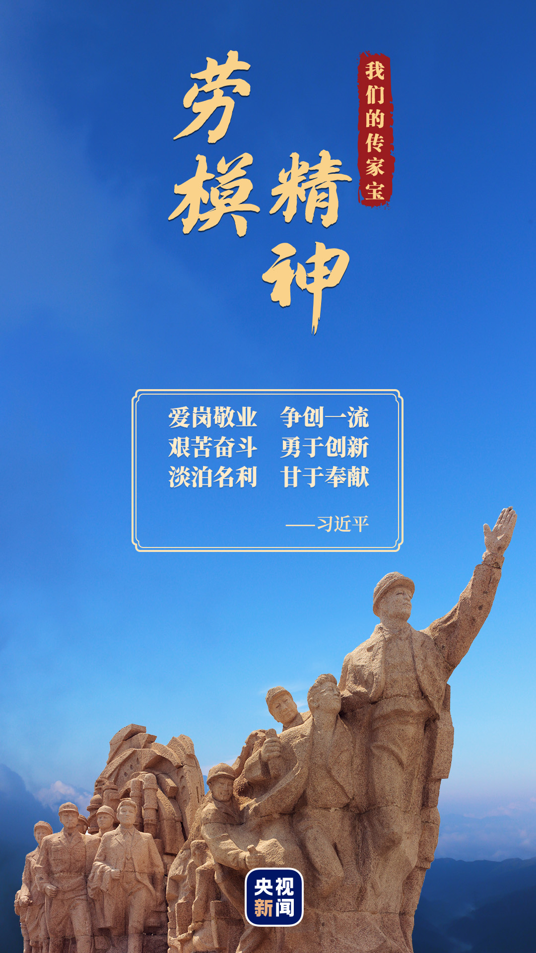“劳动模范身上体现的‘爱岗敬业、争创一流,艰苦奋斗、勇于创新,淡泊名利、甘于奉献’的劳模精神,是伟大时代精神的生动体现。”2016年4月26日,习近平同知识分子、劳动模范、青年代表座谈时指出。