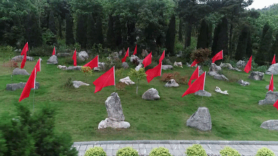 △纪念林区的每一面红旗旁,都安葬着一位红军英烈,旁边的石头上刻有编号。(总台央视记者李福远、何柏霖拍摄)