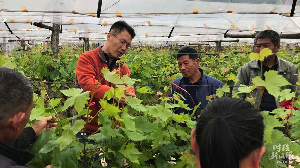 △郑吉祥(左二)是桂林市农业农村局技术员,当天他在葡萄园为总书记作介绍。(总台央视记者许达拍摄)