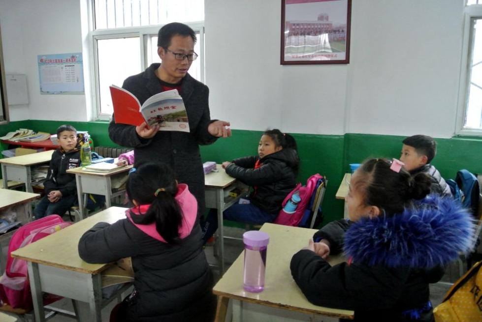 陕西省铜川市照金北梁红军小学副校长陶建刚给孩子们讲《红色照金》(2018年12月4日摄)。新华社记者 梁爱平 摄