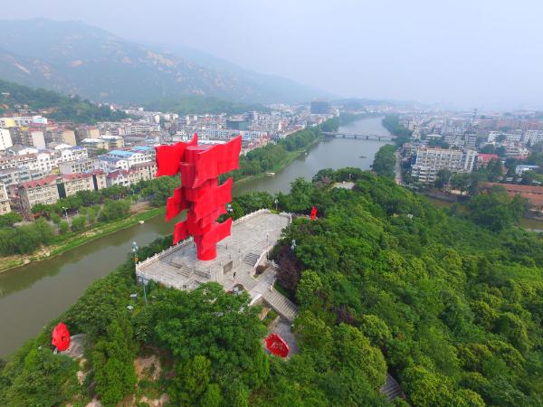 △河南省信阳市新县鄂豫皖苏区首府革命博物馆附近的英雄山八面红旗雕塑(2017年8月4日摄)。新华社记者 冯大鹏 摄