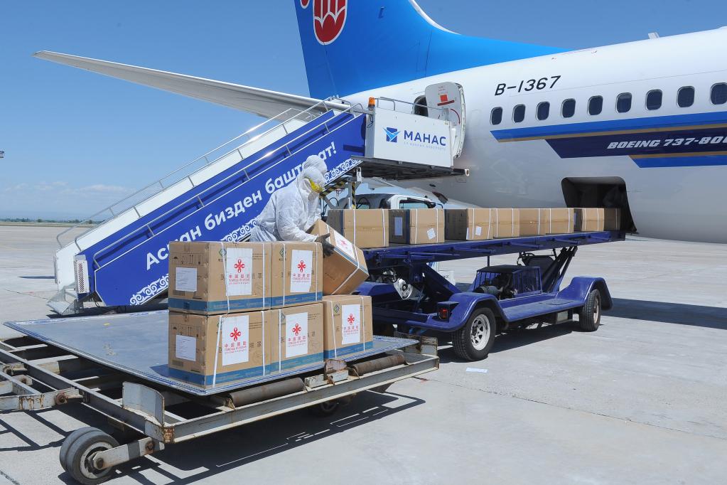 2020年5月11日,在吉尔吉斯斯坦首都比什凯克,中国政府第二批援吉抗疫医疗防护物资抵达玛纳斯国际机场。新华社发(吉尔吉斯斯坦政府新闻局供图)