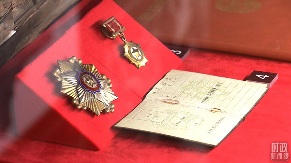 △黄继光获授的朝鲜民主主义人民共和国一级国旗勋章、金星奖章。(总台央视记者李晓周拍摄)
