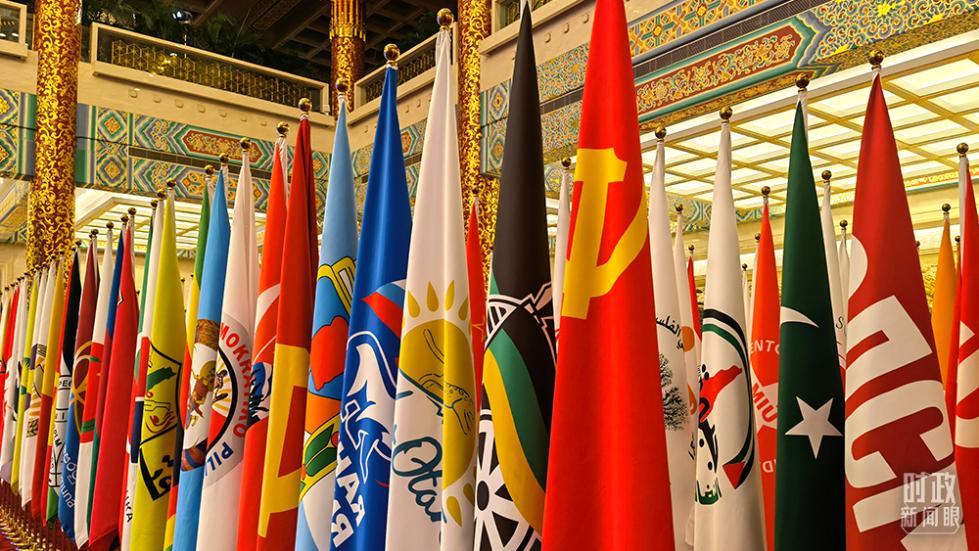 △会场上各个政党党旗旗阵。(总台央视记者石丞拍摄)