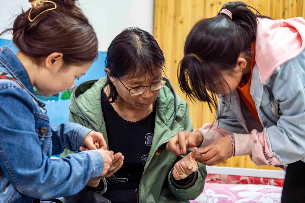△孩子们正在给张桂梅换贴止痛膏药。