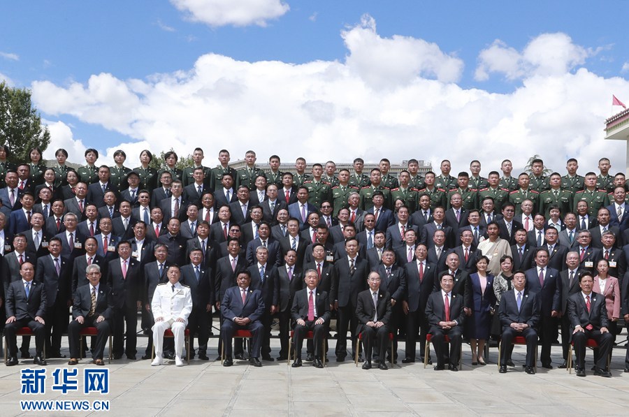 8月19日,庆祝西藏和平解放70周年文艺演出《西藏儿女心向党》在西藏人民会堂精彩上演。中共中央政治局常委、全国政协主席、中央代表团团长汪洋,与西藏自治区各族各界干部群众600余人一起观看演出。这是演出开始前,汪洋会见西藏自治区领导班子成员、离退休老同志,各族各界、寺管干部、政法干警和驻藏解放军、武警部队官兵代表,并同他们合影留念。新华社记者 丁林 摄