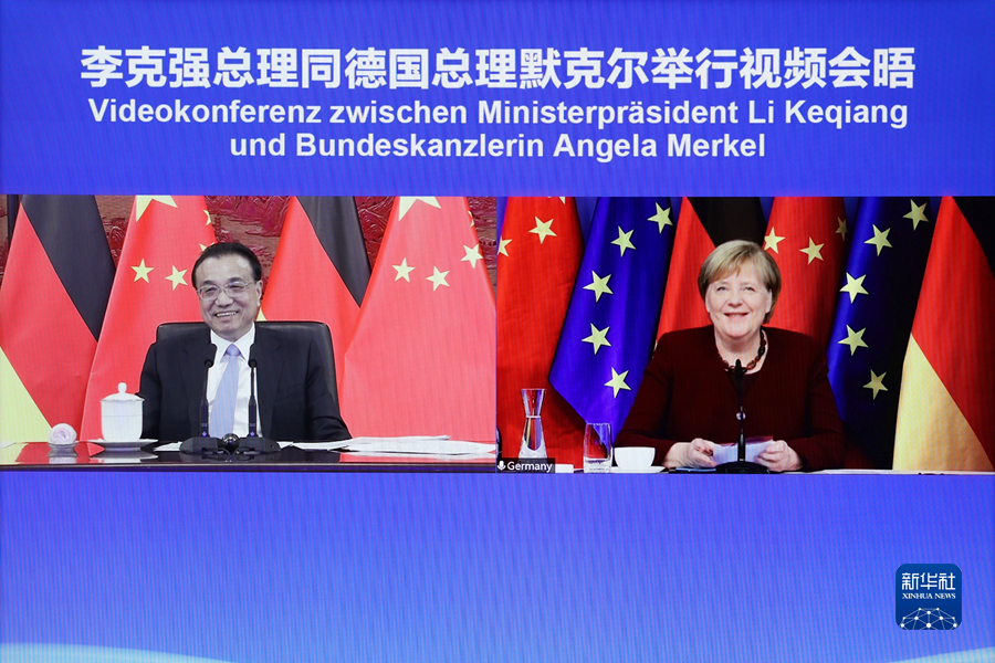10月18日,国务院总理李克强在北京中南海紫光阁同德国总理默克尔举行视频会晤。 新华社记者 刘彬 摄