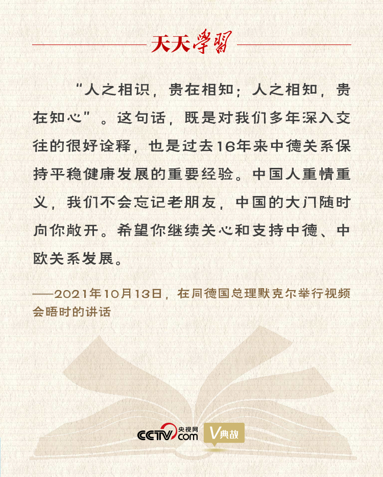 10月13日,习近平主席同德国总理默克尔举行视频会晤。双方在友好的氛围中回顾近年中德、中欧关系发展并就相关问题深入交换意见。习主席积极评价默克尔任内为推动中德、中欧关系发展所作的贡献,并引用“人之相识,贵在相知;人之相知,贵在知心”,称这句话“既是对我们多年深入交往的很好诠释,也是过去16年来中德关系保持平稳健康发展的重要经验”。