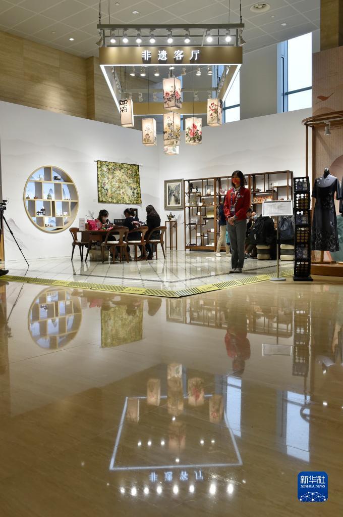 这是11月4日拍摄的第四届进博会新闻中心内的非遗文化展示区。新华社记者 鲁鹏 摄