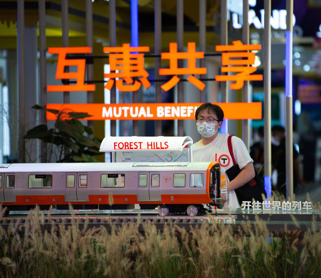 2021年9月4日,在国家会议中心中国服务贸易发展成就展上,观众参观中国轨道交通出口装备模型。