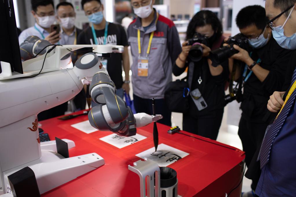 2021年11月7日,在第四届进博会技术装备展区,一款书法机器人吸引参观者目光。