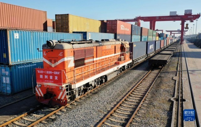 今年11月23日,江苏连云港。一列装载着生活用品、家用电器等货物的中欧班列由此首发、飞驰而去,将于20天后抵达莫斯科沃尔西诺站。