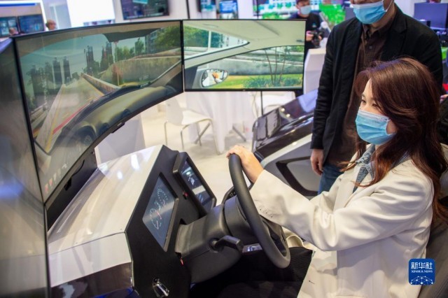 11月19日至21日,2021中国5G+工业互联网大会在位于武汉的中国光谷科技会展中心举行。这是 11月19日,参观者在“5G+工业互联网成果展”上体验驾驶智能模拟器。新华社发(伍志尊 摄)