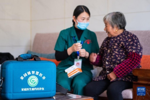 11月12日,在湖南省长沙市长沙县果园镇杨泗庙社区,医务人员刘敏指导居家老人用药。新华社记者 陈思汗 摄