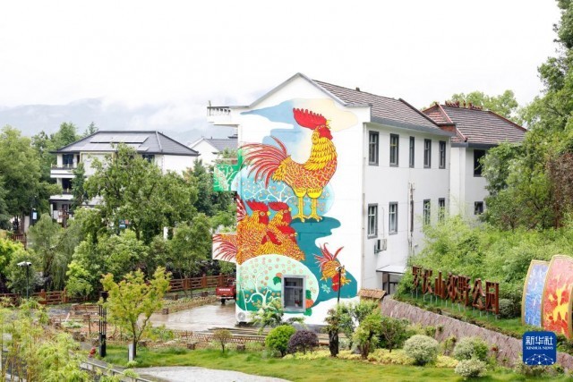 这是浙江衢州市柯城区沟溪乡余东村建筑墙壁上的农民画“大公鸡”(5月11日摄)。新华社发