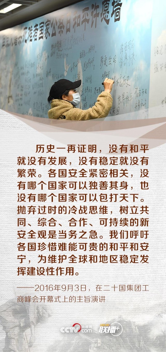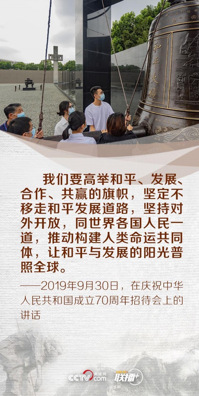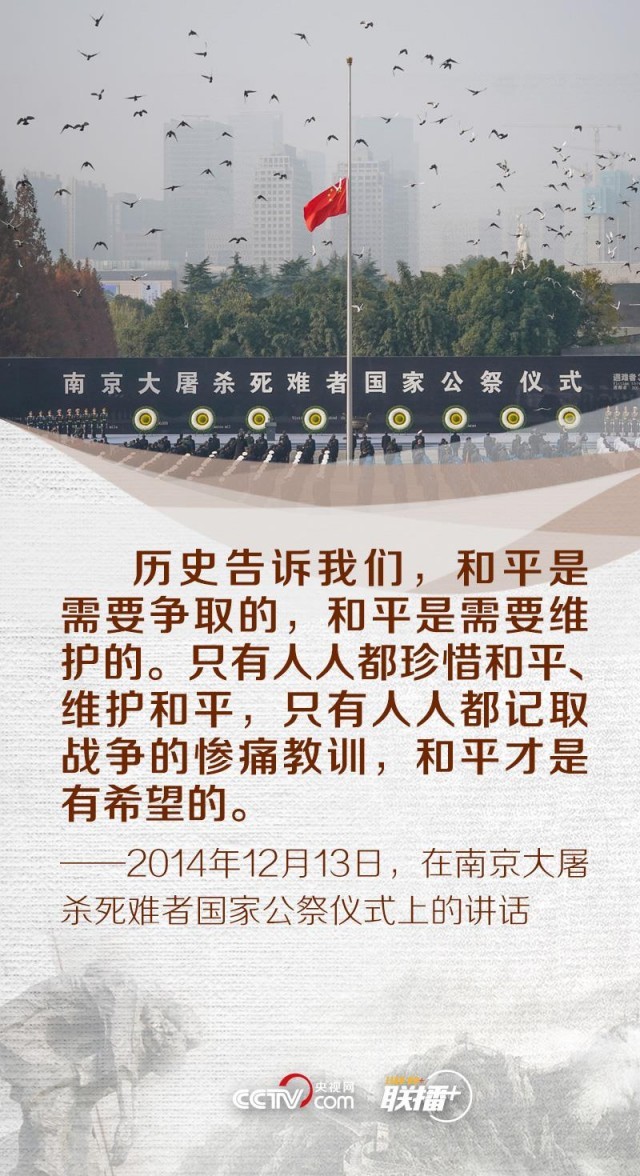 “历史不会因时代变迁而改变,事实也不会因巧舌抵赖而消失。”“和平像阳光一样温暖、像雨露一样滋润。有了阳光雨露,万物才能茁壮成长。有了和平稳定,人类才能更好实现自己的梦想。”2014年、2017年,习近平总书记曾两次出席南京大屠杀死难者国家公祭仪式。