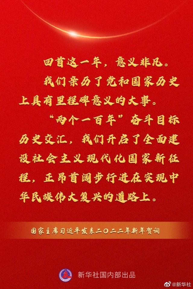 习近平:回首这一年,意义非凡。我们亲历了党和国家历史上具有里程碑意义的大事。“两个一百年”奋斗目标历史交汇,我们开启了全面建设社会主义现代化国家新征程,正昂首阔步行进在实现中华民族伟大复兴的道路上。