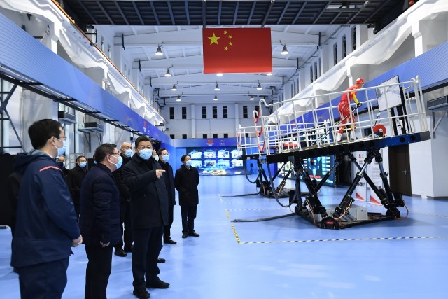 1月4日,中共中央总书记、国家主席、中央军委主席习近平在二七厂冰雪项目训练基地六自由度训练馆考察。新华社记者 燕雁 摄