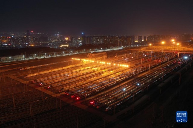 1月16日晚,动车组列车停靠在中国铁路兰州局集团有限公司兰州车辆段兰州西动车运用所整备场上,为1月17日开始的2022年春运做好准备(无人机照片)。新华社记者 杜哲宇 摄