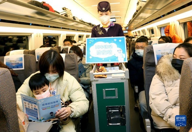 1月16日,乘务员在上海虹桥开往汉口的G1724次列车上向旅客分发防疫宣传册。新华社记者 陈飞 摄
