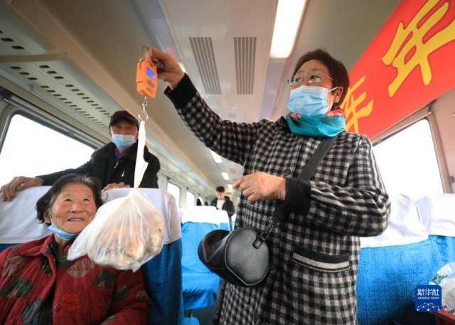 1月15日,在4318次列车上,一名农民给旅客购买的猪肉称重。这是一辆行驶在东北东部山区的慢火车。为助力乡村振兴,中国铁路沈阳局集团有限公司吉林客运段在列车上开办“年货大集”。沿线各村镇的农民不用等到进城,就可在车厢里售卖自家山货。新华社记者 杨青 摄
