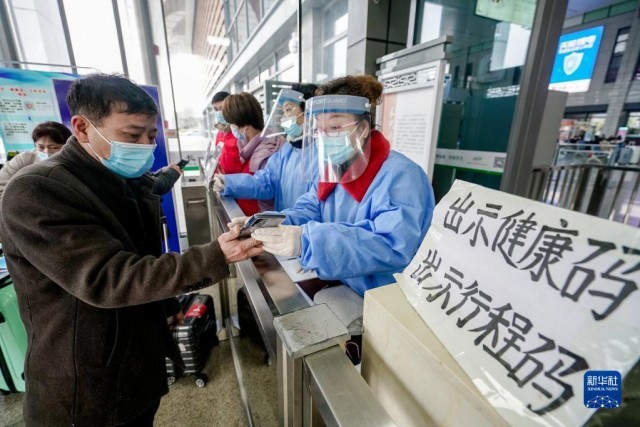 1月17日,在浙江省湖州市长兴站进站口,防疫工作人员和辖区志愿者查验进站旅客健康码、行程码。新华社发(吴拯摄)