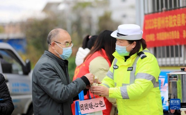 1月17日,在209国道广西柳州市融安县段“春运爱心驿站”,交通辅警为司乘人员送姜糖茶。
