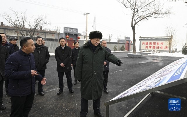 1月26日至27日,中共中央总书记、国家主席、中央军委主席习近平来到山西,看望慰问基层干部群众。这是26日下午,习近平冒雪在临汾市霍州市师庄乡冯南垣村考察。新华社记者 李学仁 摄