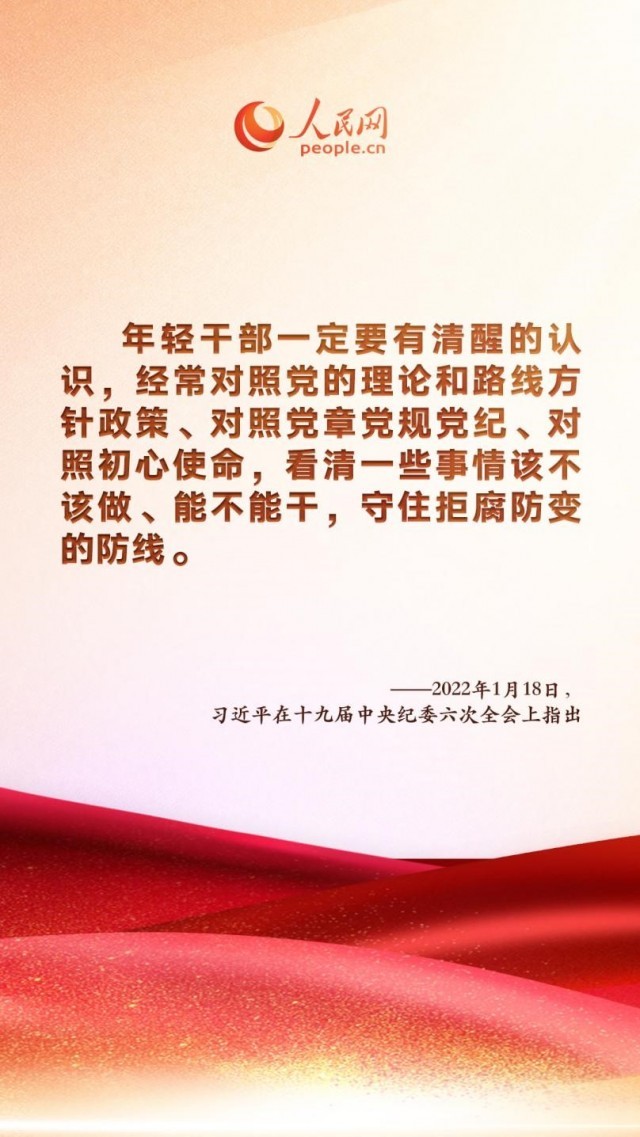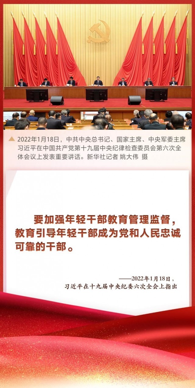 “要加强年轻干部教育管理监督,教育引导年轻干部成为党和人民忠诚可靠的干部。” 中共中央总书记、国家主席、中央军委主席习近平在十九届中央纪委六次全会上发表重要讲话,深刻总结新时代党的自我革命的成功实践,深刻阐述全面从严治党取得的历史性、开创性成就,产生的全方位、深层次影响,对坚持不懈把全面从严治党向纵深推进、迎接党的二十大胜利召开作出战略部署。