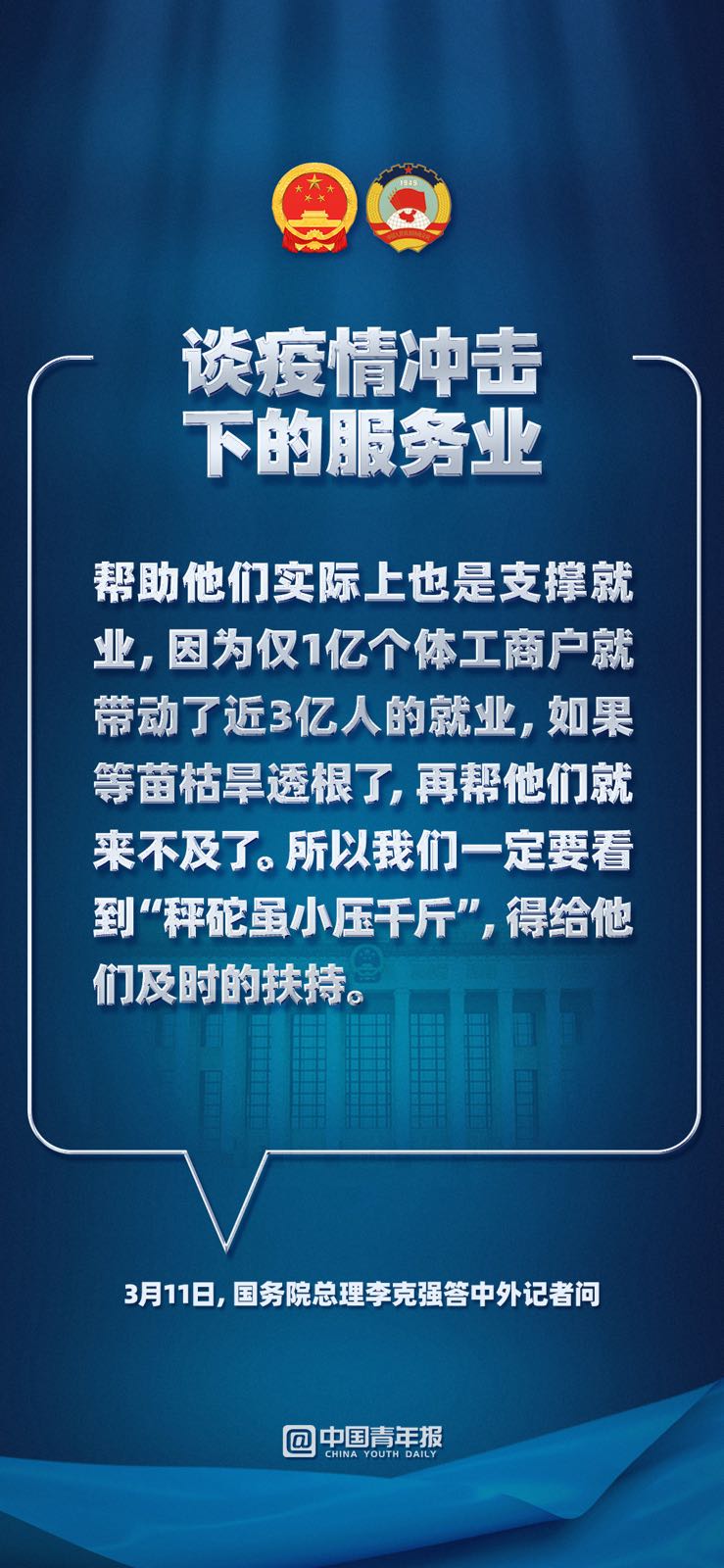 中国青年报客户端北京3月11日电(中青报·中青网记者焦敏龙 叶雨婷 王鑫昕 刘尚君)新冠肺炎疫情中,好多小店关了没再开。今天上午,国务院总理李克强在记者会上表示,疫情发生后,受冲击最大的是服务业,特别是接触型的服务业,其中量大面广的是中小微企业。他们底子本来就薄,而且可以说是精打细算、日清月结的经营,很多困难积累起来让他们难以支撑。帮助他们实际上也是支撑就业,因为仅1亿个体工商户就带动了近3亿人的就业,如果等苗枯旱透根了,再帮他们就来不及了。所以我们一定要看到“秤砣虽小压千斤”,得给他们及时的扶持。