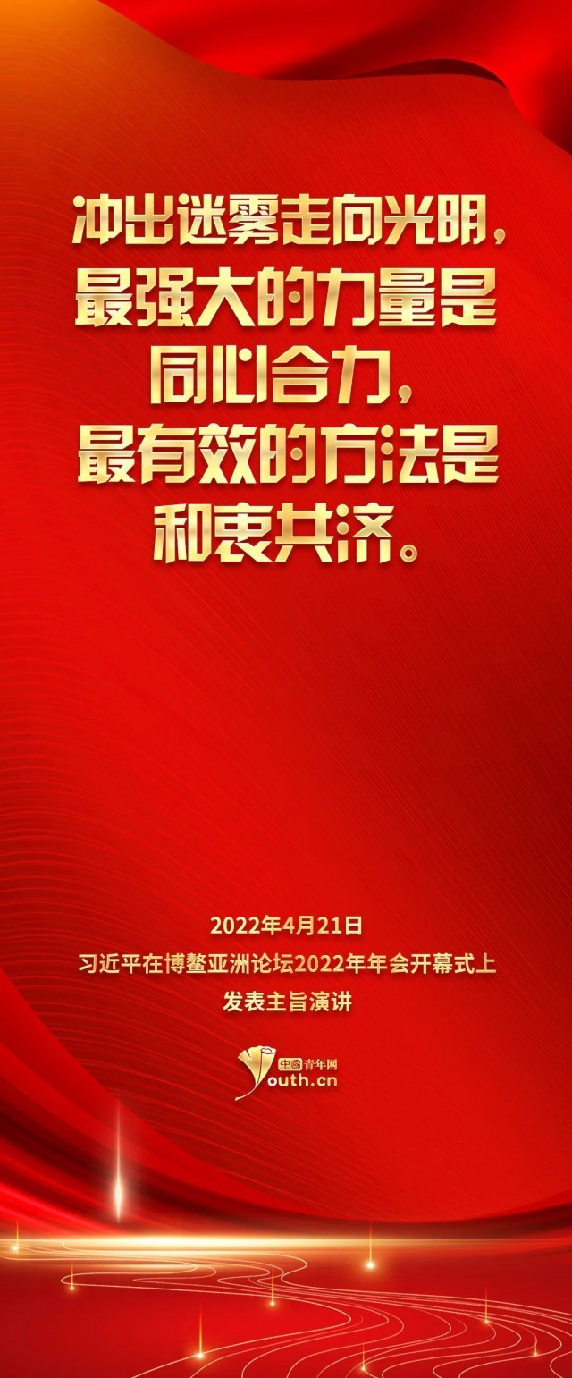 习近平主席在博鳌亚洲论坛2022年年会开幕式上演讲时强调,冲出迷雾走向光明,最强大的力量是同心合力,最有效的方法是和衷共济。习近平主席掷地有声的话语,以中国智慧回答了世界之问、时代之问、历史之问,为共创亚洲和世界美好未来注入了强大信心和更多正能量。