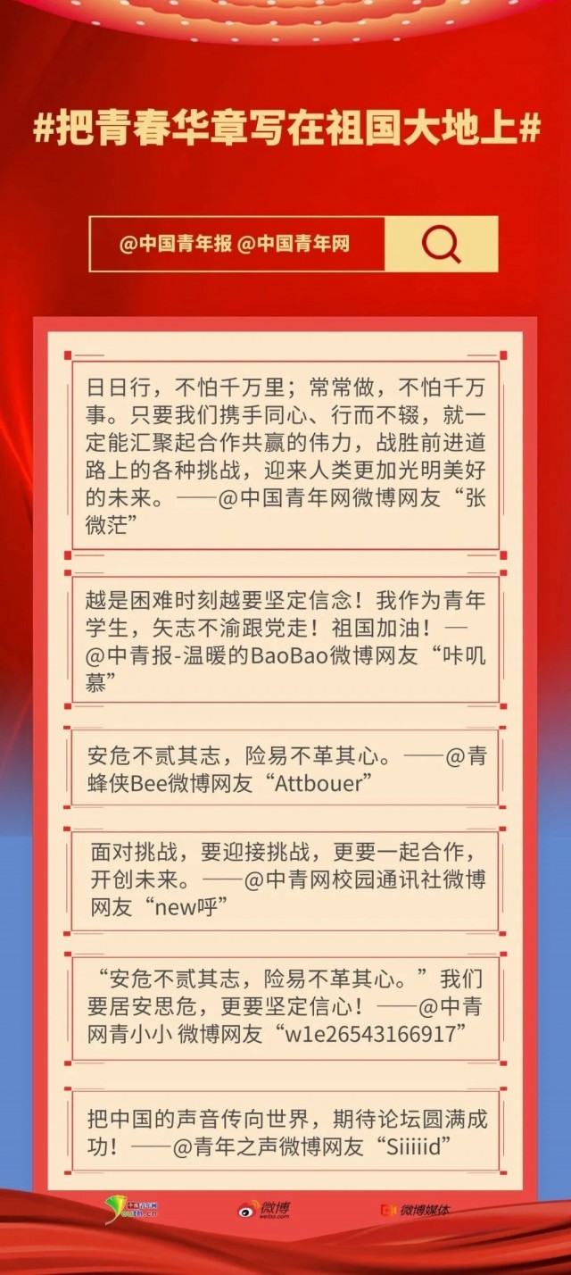 希望青年朋友们把习近平主席的讲话精神作为重大时代主题融入思想与实践之中,在贯通历史和现实、理论和实践、国内和国际的基础上,从历史长河、时代大潮、全球风云中去分析机理和探求规律,着力学清学透世界之变、时代之变,更要学清学透推动构建人类命运共同体的道路正确性和历史必然性,尤其要深度对接实现第二个百年奋斗目标的新征程与实现中华民族伟大复兴的中国梦,深刻理解和把握中国共产党“为中国人民谋幸福,为中华民族谋复兴”的初心使命,以及“为人民谋幸福、为人类谋进步的历史责任”,体悟中国共产党在任何艰难曲折中都始终坚定信心、激流勇进的政治担当和精神气概,在时代大课中坚定信仰信念信心,树立奉献祖国、服务人民、造福人类的大情怀、大担当,以青春之我,为青春之中国、青春之民族、青春之世界而奋斗!