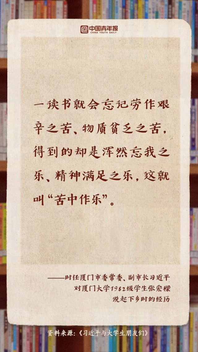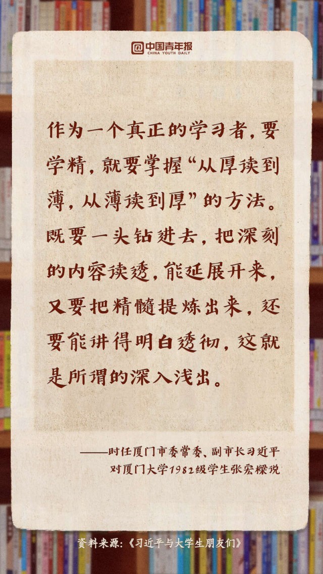 今天是第27个世界读书日,中国青年报刊发的《习近平与大学生朋友们》系列采访实录中,大学生朋友们回忆了习近平总书记的读书之道:读书要“从厚读到薄,从薄读到厚”;青年学生“既要读有字之书,也要读无字之书”;读书得到的是“浑然忘我之乐、精神满足之乐”……