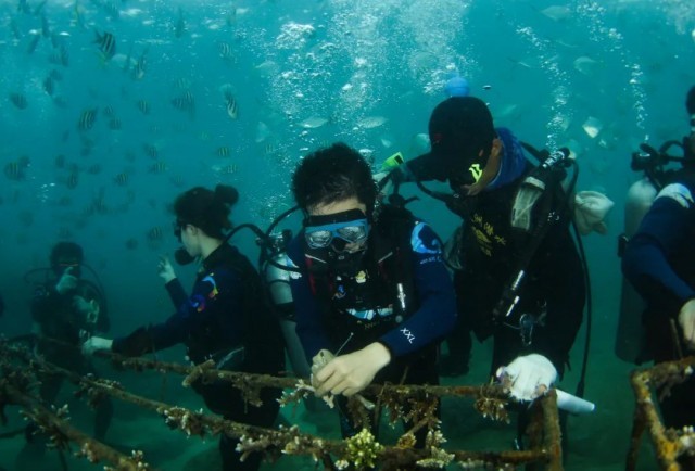 2022年1月30日, 海南三亚蜈支洲岛海域,游客在体验种植珊瑚 杨冠宇摄 / 本刊