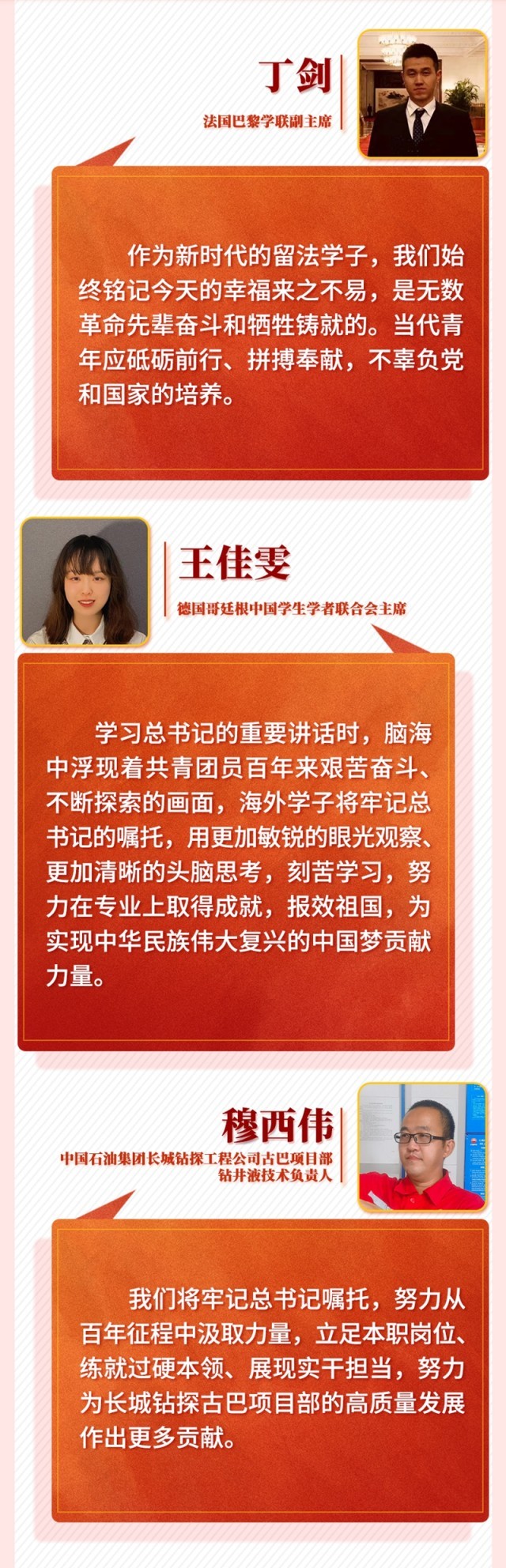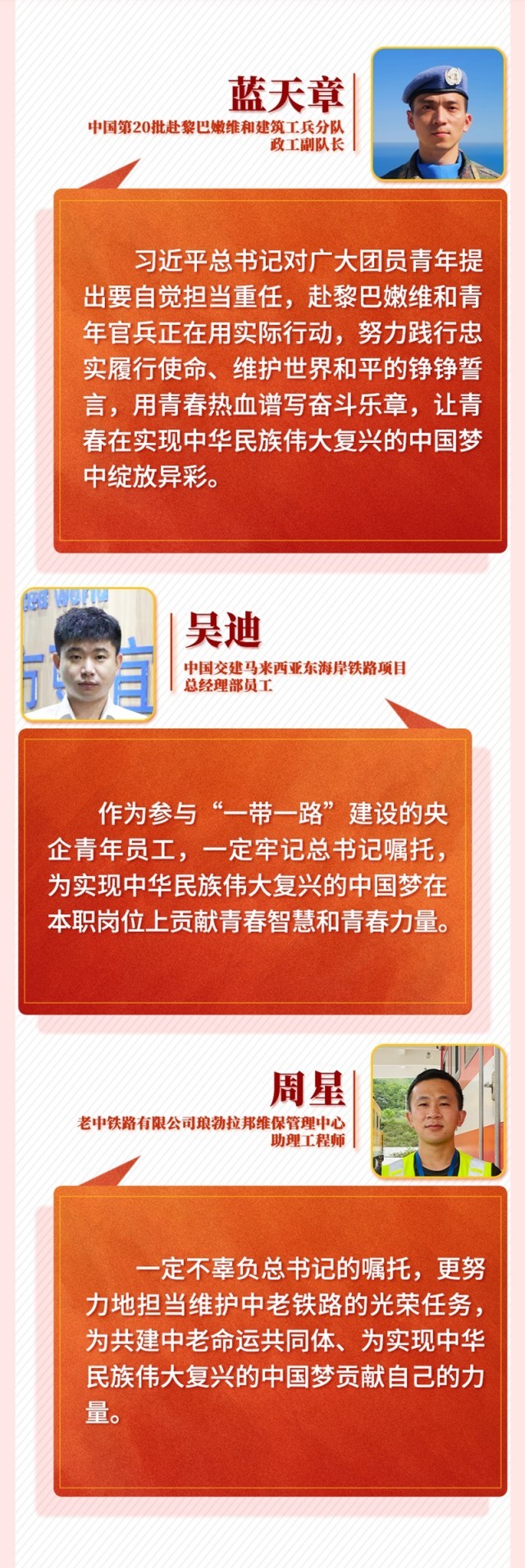 习近平总书记的重要讲话令身在海外的中国青年备受鼓舞。他们一致表示,作为新时代的中国青年,一定牢记习近平总书记嘱托,带着梦想和使命,让青春在海外焕发异彩,在实现中华民族伟大复兴中国梦的新征程上奋勇前进,用青春的智慧和汗水打拼出一个更加美好的中国。
