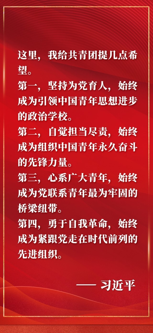 庆祝中国共产主义青年团成立100周年大会10日上午在北京人民大会堂隆重举行。中共中央总书记、国家主席、中央军委主席习近平在会上发表重要讲话,全面回顾百年来共青团坚定不移听党话、跟党走的奋斗历程,深刻阐明共青团和青年工作的宝贵经验,对当代青年寄予殷切期望,对做好新时代共青团工作提出明确要求。