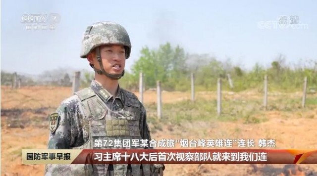 第72集团军某合成旅“烟台峰英雄连”连长 韩杰:习主席十八大后首次视察部队就来到我们连,这份厚爱早已转化为我们练兵备战的动力。近十年来,我们始终不忘主席重托,在真难实严环境中磨砺战斗作风,锤炼胜战本领,让大家一到演训场,就感觉像打仗一样,敢碰硬,敢冲锋!