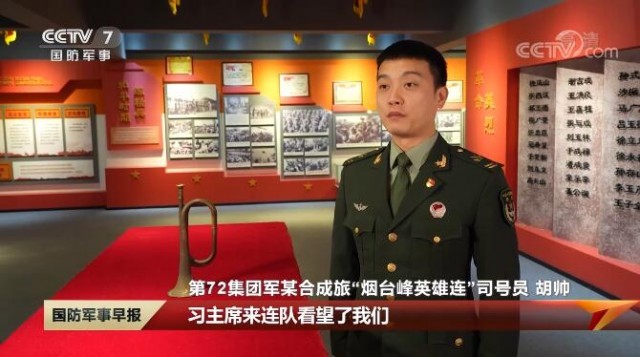 第72集团军某合成旅“烟台峰英雄连”司号员 胡帅:习主席来连队看望了我们,并和我们全连官兵一起合了影,当时我是站在第一排,主席亲切地和我们握了手。合影完毕后,主席来到我们连队荣誉室,主席对英雄的尊崇当时是深深地触动了我。在连队培养下,我成为了一名司号员,一定要立足自身岗位让革命先辈的号音在新时代继续吹响。