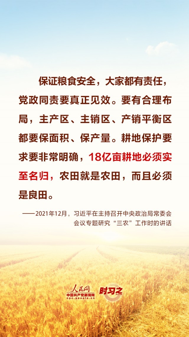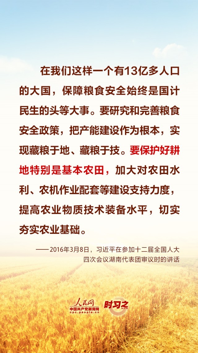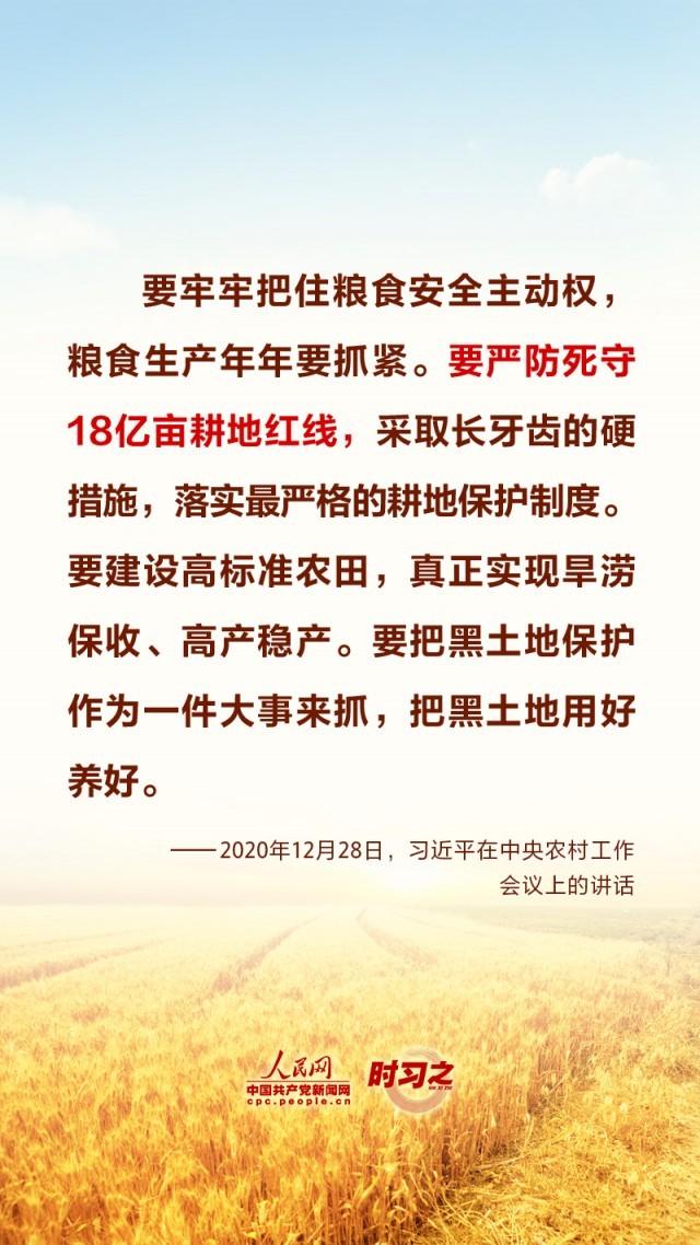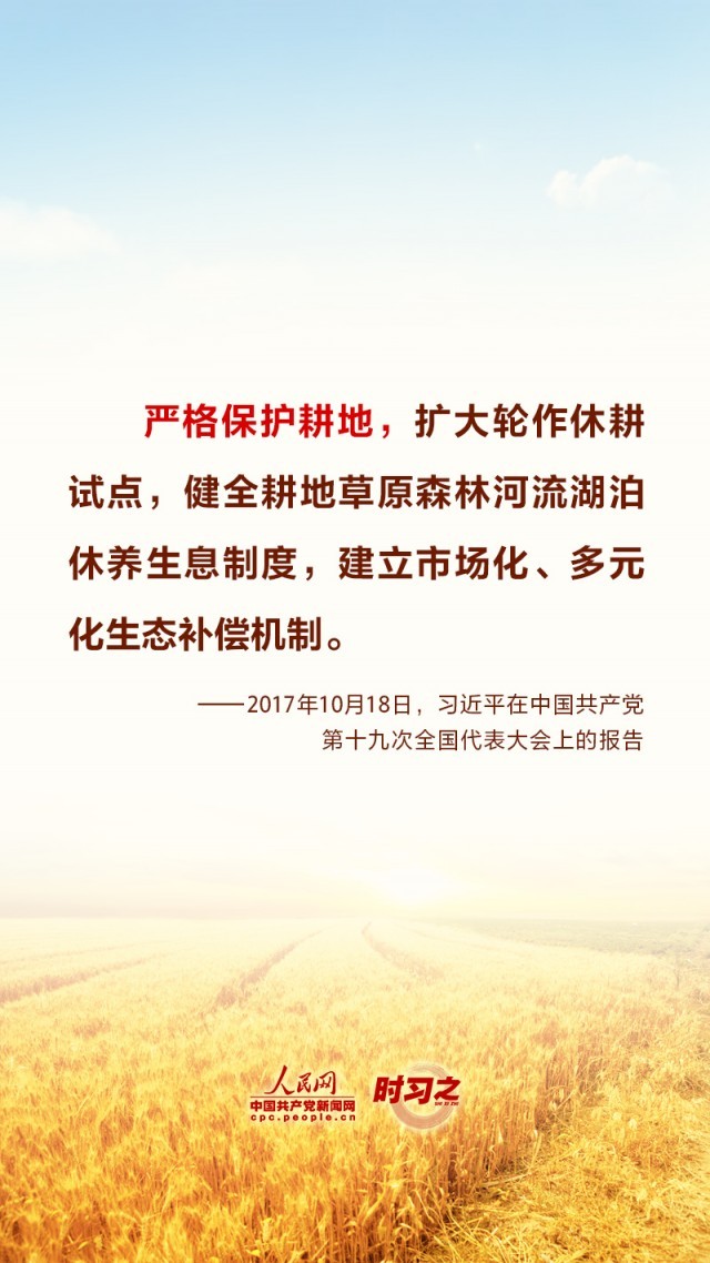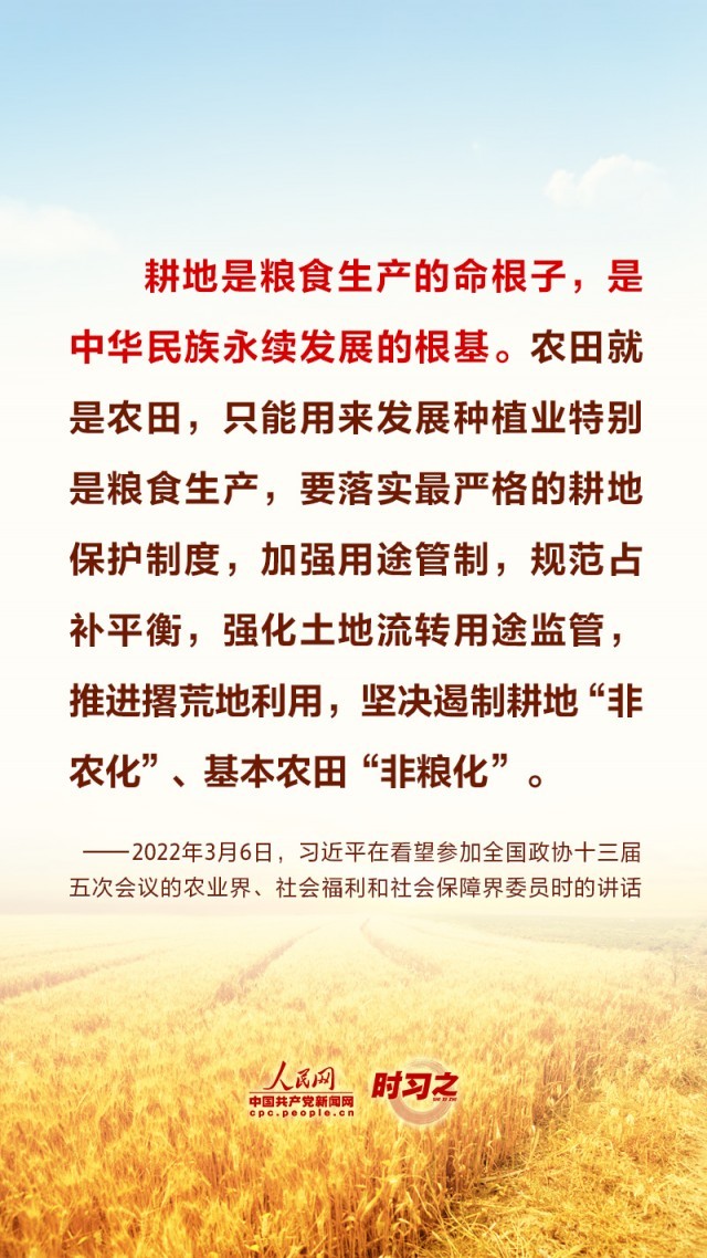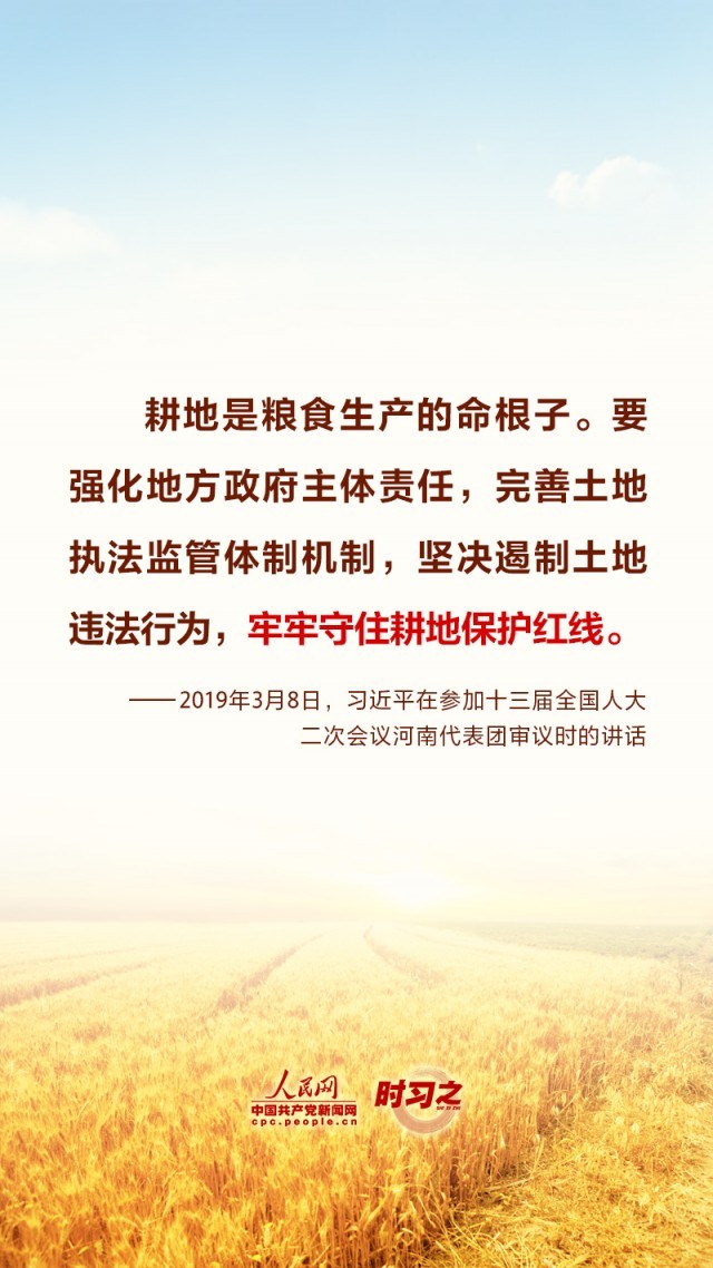 “民非谷不食,谷非地不生。”粮食安全在习近平总书记心中有着特殊的分量,他多次深入田间地头察墒情、看苗情、问收成,明确指出“耕地是粮食生产的命根子”。耕地是我国最为宝贵的资源,坚持藏粮于地、端稳中国饭碗,“希望的田野”终将麦浪滚滚、稻花飘香。